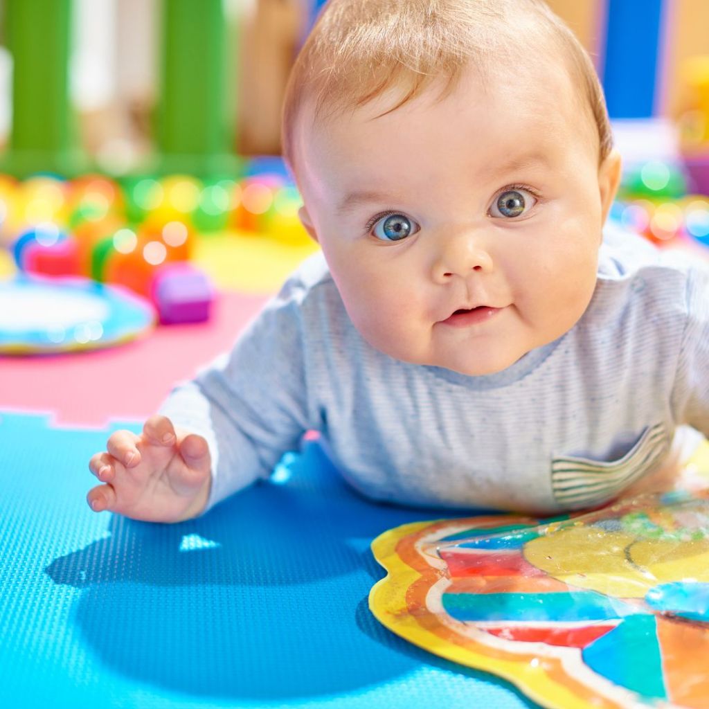 - Use Engaging Toys and Mirrors: Make tummy time engaging by placing colorful toys, soft rattles, or baby-safe mirrors within your baby’s reach. The visual stimulation encourages your baby to lift their head and explore their surroundings. You can also lie down in front of your baby and make funny faces or sounds to capture their attention. Check out this cool water mat, specially designed for tummy time!